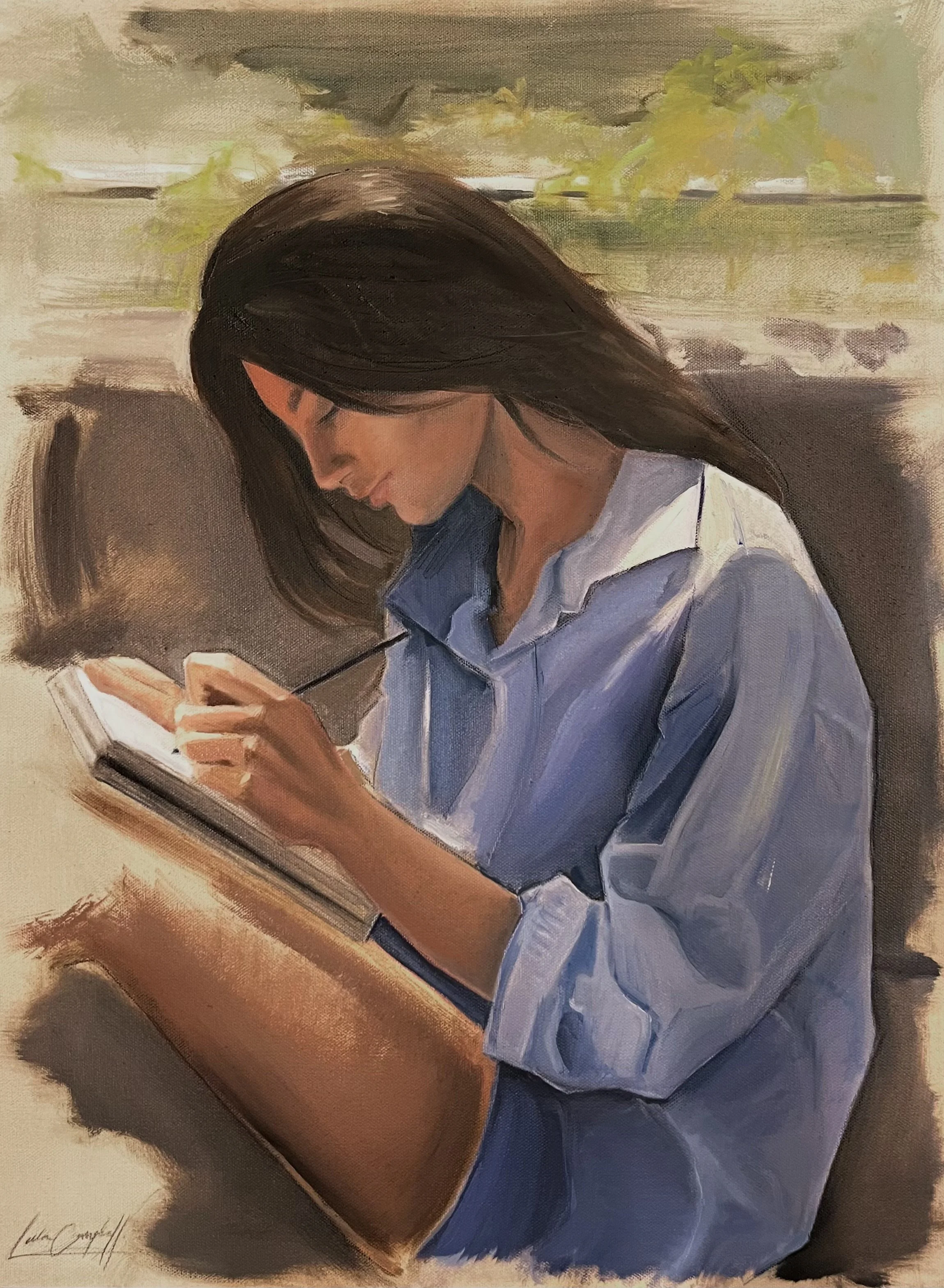This is a painting of my best friend sketching in the park, a very happy and soothing memory. We love to be outdoors in nature whenever possible, and we often use our downtime to create art. Because our school schedules are so rigorous and demanding, special moments like this can feel like a religious experience. They connect us back to something greater than ourselves, and allow us forget our stresses for a short time. In this piece, I balance precision and fluidity, using refined edges for the subject’s hands and face while letting the surrounding environment dissolve into painterly abstraction. Forced perspective helps me to define a focal point for the viewer.