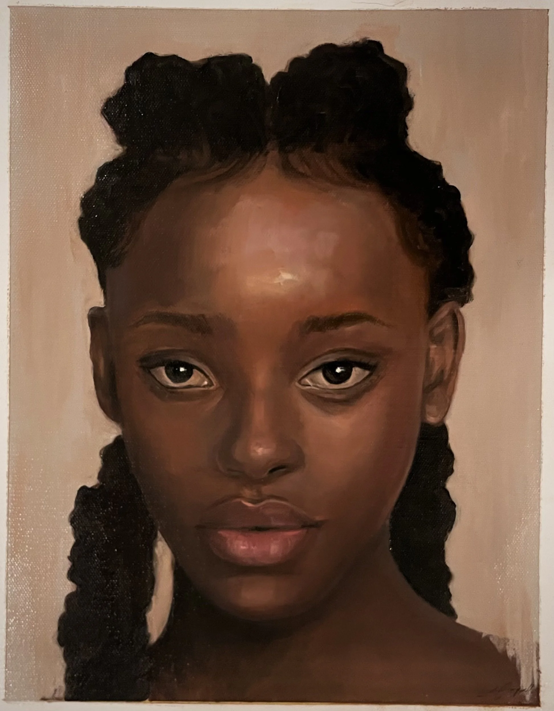 There is something very special to me about how the shapes of one's features can give different impressions, making the viewer feel an array of emotions simply by looking at them. I find the human eye the most challenging yet exciting anatomical component to paint—here, I capture a defiant yet helpless stare, with her gaze directly on the viewer to draw you in.