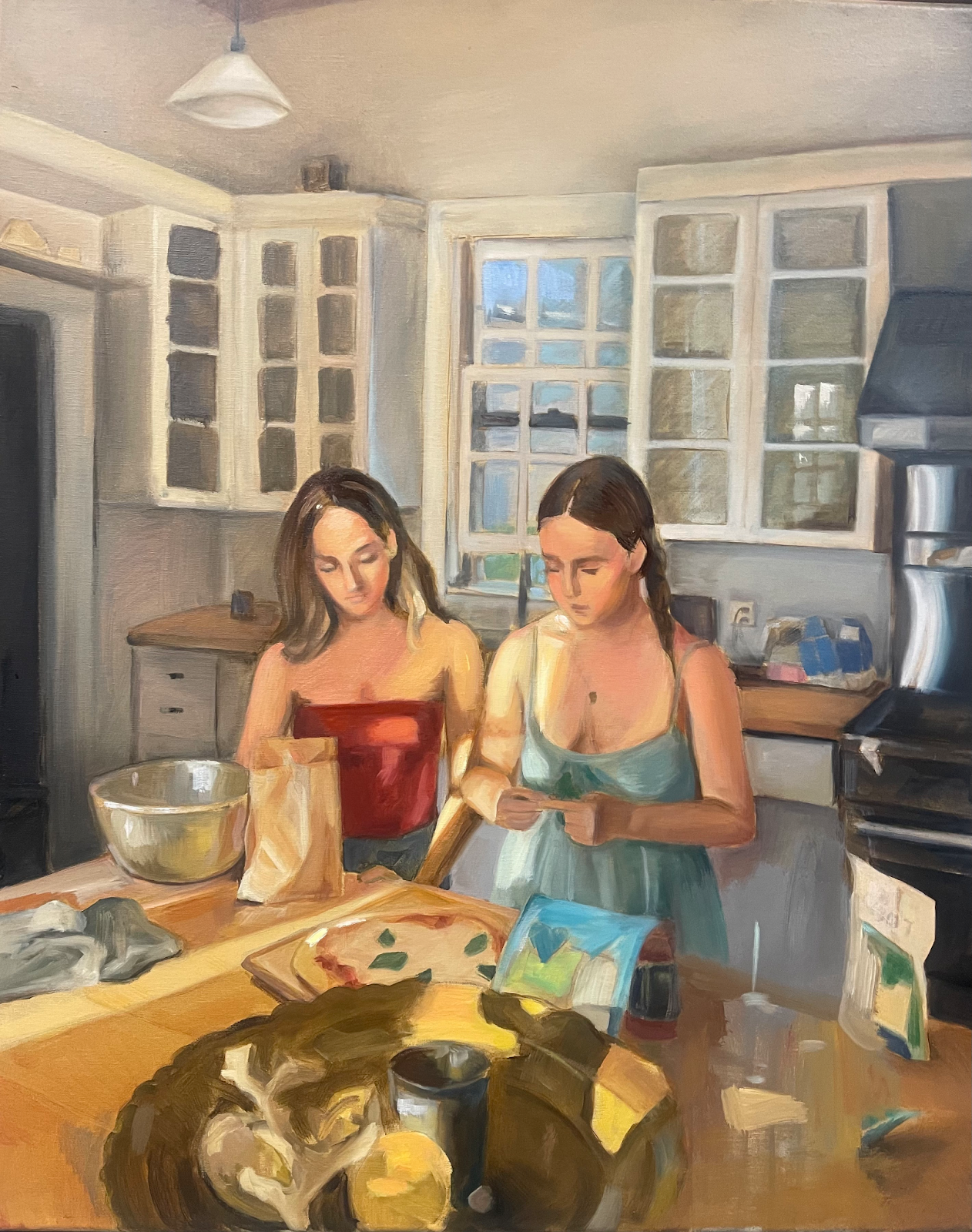 This painting depicts my friend and I preparing a homemade pizza in my warmly lit kitchen. The soft light streaming through the window scatters light throughout the room, creating a gentle rhythm that lightly covers our shoulders. Simple moments like this with friends are so important, especially because we only have one more year together in school before we go away to college. I like to paint scenes like this because they cement the emotions of the moment in my mind so that when the freshness of memory fades, I will be able to look at this piece and be transported back in time.