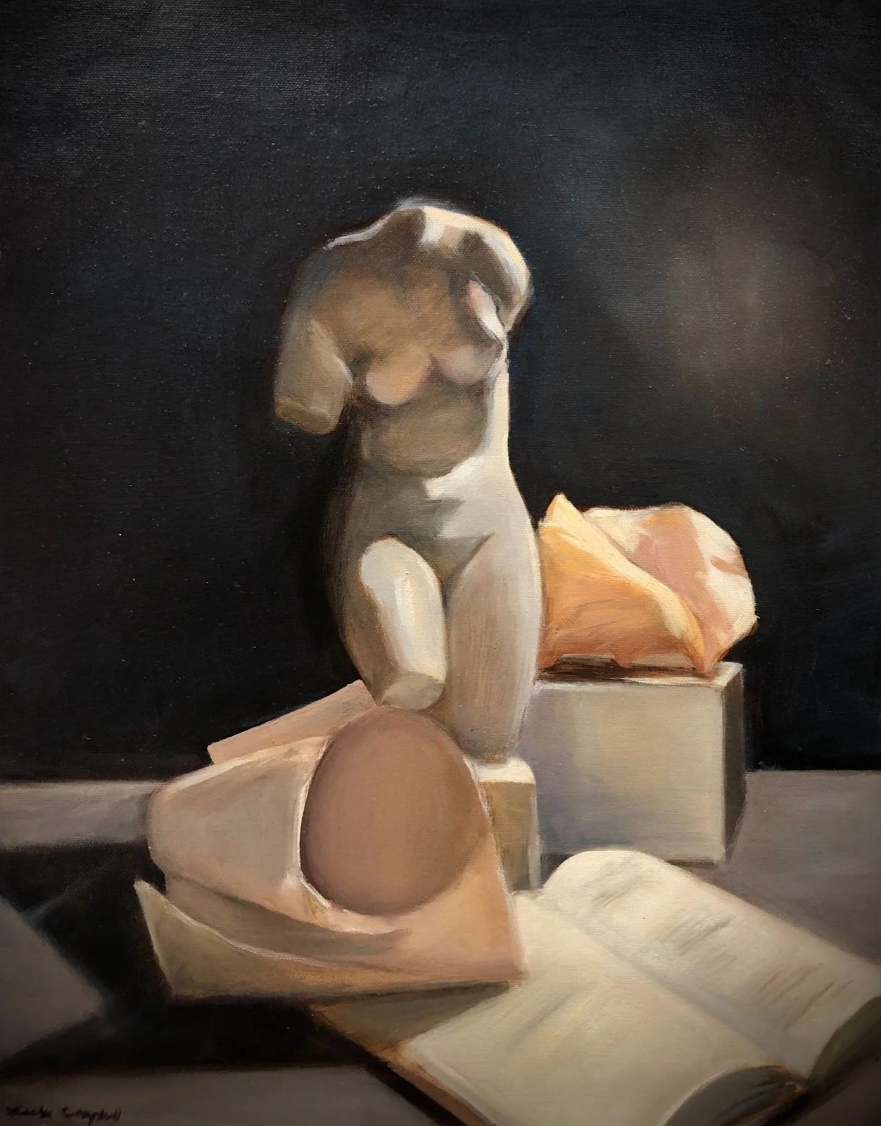 This still life examines color, form, shadow, and light in an art historical context referencing the Dutch Golden Age. Venus is central and represents femininity, the book symbolizes knowledge and wisdom, and the shell represents Venus’s birth from the sea. This piece overall represents the human and specifically feminine pursuit of knowledge and beauty in an age where it is hard to keep a balance between the two.