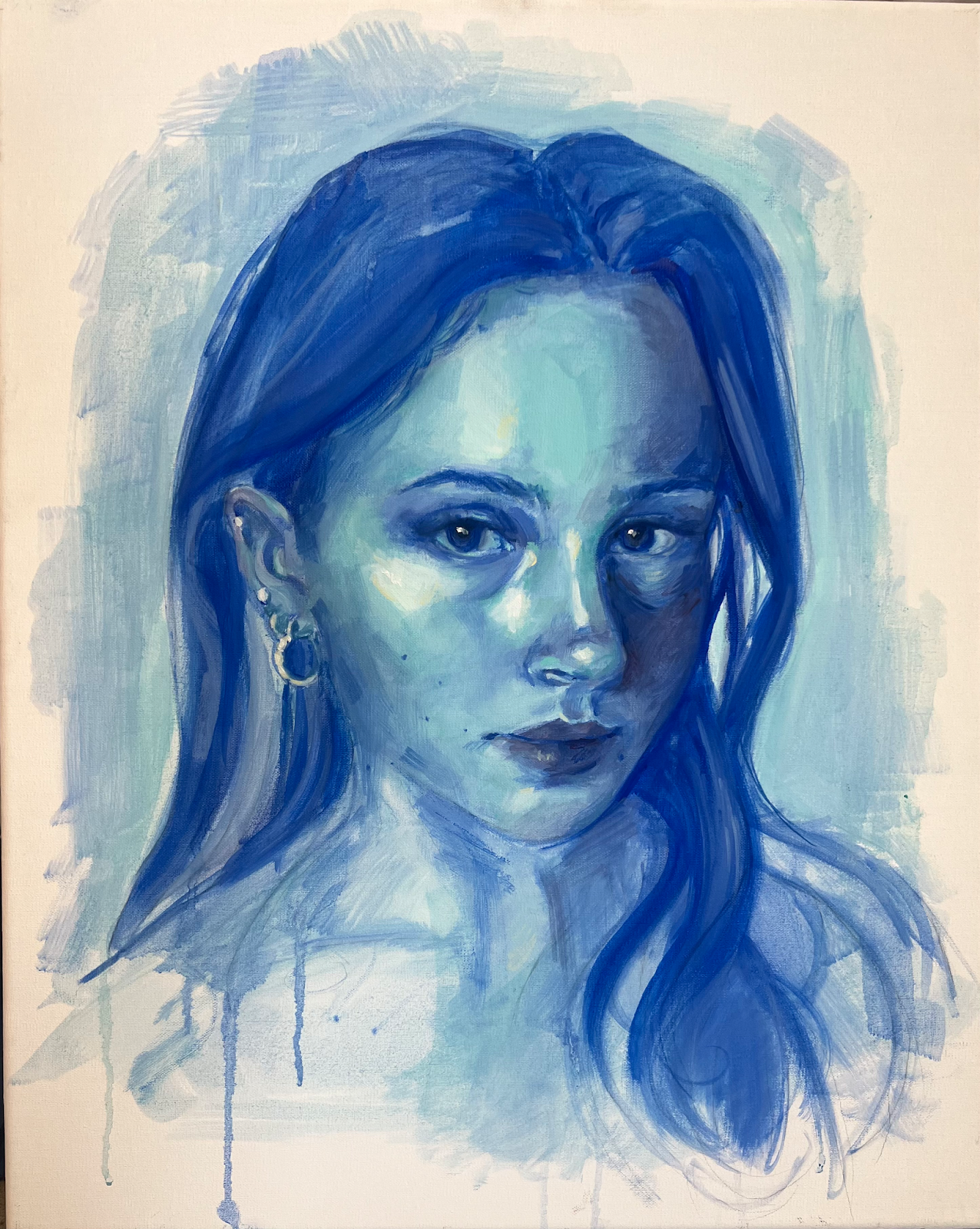 This self-portrait represents my struggle with the rare condition of stereo blindness that prevents me from seeing in three dimensions. Although my disability has been a challenge for me in daily life, it has paradoxically helped me to excel in art by allowing me to fluidly translate the two dimensions I see onto a flat canvas. For me, painting bridges the gap between how I perceive the world around me and how others do. The use of a color palette of cool blues forces the viewer to experience a type of vision impairment by limiting their visual world to a single color which leads them to question whether their perception accurately reflects reality.