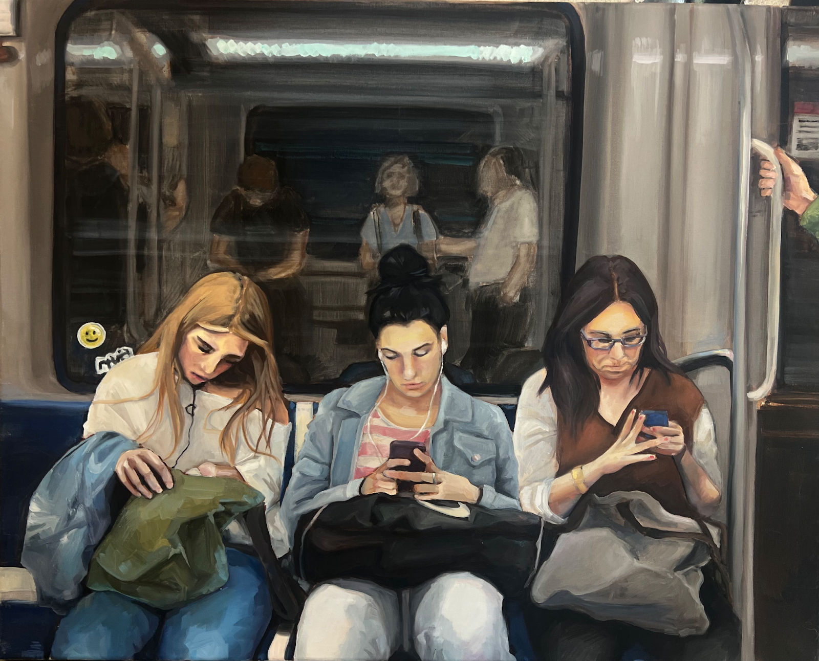 This piece invites the viewer to consider the social dynamics of urban life and the impact of modern technology on our ability to engage with those around us. Three figures sit shoulder to shoulder on the subway (much closer than strangers generally sit), but are oblivious to one another. They are so enamored by the latest social media trend or sensational headline plastered across the news, that they don't even realize there are real people to connect with within an inch of their physical selves. The painting is a reflection on contemporary culture and a quiet acknowledgment of the shared human experience within it, whether that be positive or negative.