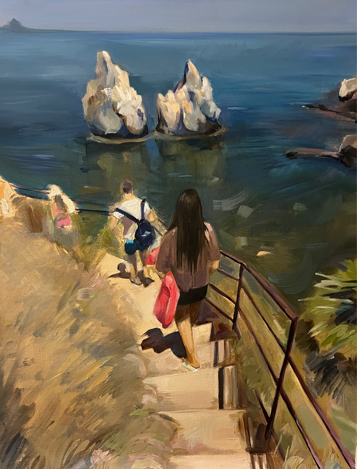 This is a scene I painted after a trip to Sicily with my family. The viewer's perspective from above invites them to follow the figures descending the rocky steps. Their movements are framed by desert-tropical plants and huge rock formations in the sea. I love the incredibly varied Italian coastline. From sandy beaches, to impossibly high cliffs, to mini islands dramatically rising from the sea, to the oceanic blues effortlessly melding between aqua and navy, my eyes never tire of the views. I maintained a vibrant but slightly muted color palette in this piece so it felt authentic but not too kitsch.